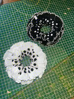 Top quality cotton in a polka dot print with a double layer of whimsical trims.